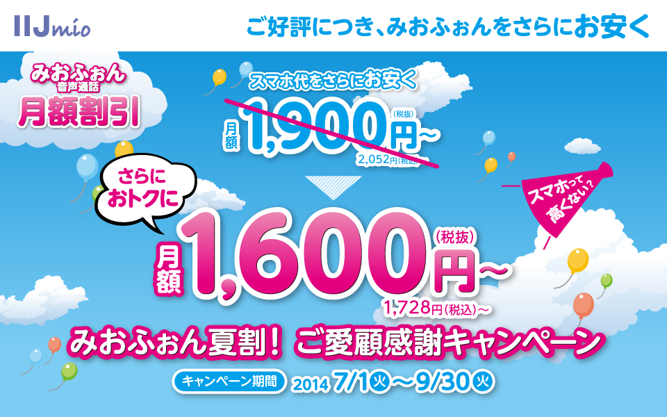 IIJmio高速モバイル/Dサービス 音声通話機能付きSIM(みおふぉん)をこれからご利用いただく、またはご利用いただいている方に感謝の意を表し、月額料金をさらにおトクに1,600円(税抜) からご利用いただける、「みおふぉん夏割!ご愛顧感謝キャンペーン」を行います。